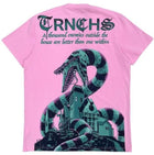 The 'OROCHIMARU' Pink Tee delivers a powerful visual narrative with its bold design and symbolic messaging. The back features a striking illustration of a serpent coiled around a house, paired with the impactful text, “A thousand enemies outside the house are better than one within.” The front maintains a minimalist design with the same statement under the Trnchs logo, making it both thought-provoking and stylish.